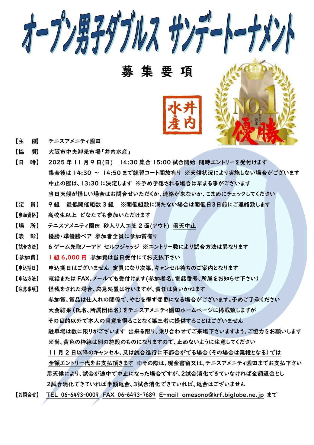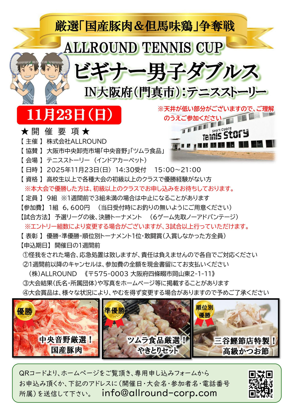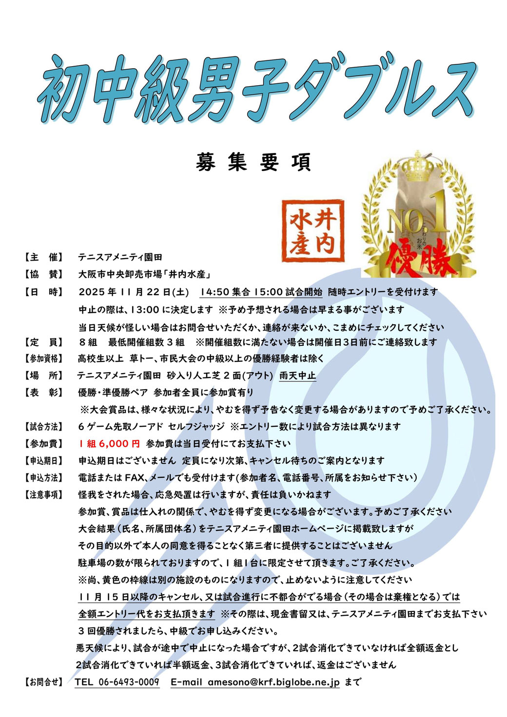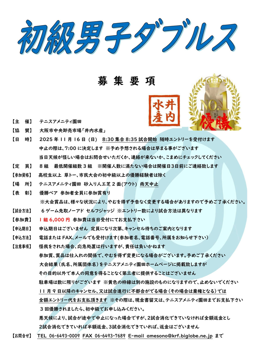 初心者からオープンの方を対象に開催している男子ダブルスの大会です。初心者の方にも気軽にご参加頂けるよう、グレードごとに分けステップアップしながら楽しんで頂ける大会です。皆様のご参加お待ちしております。